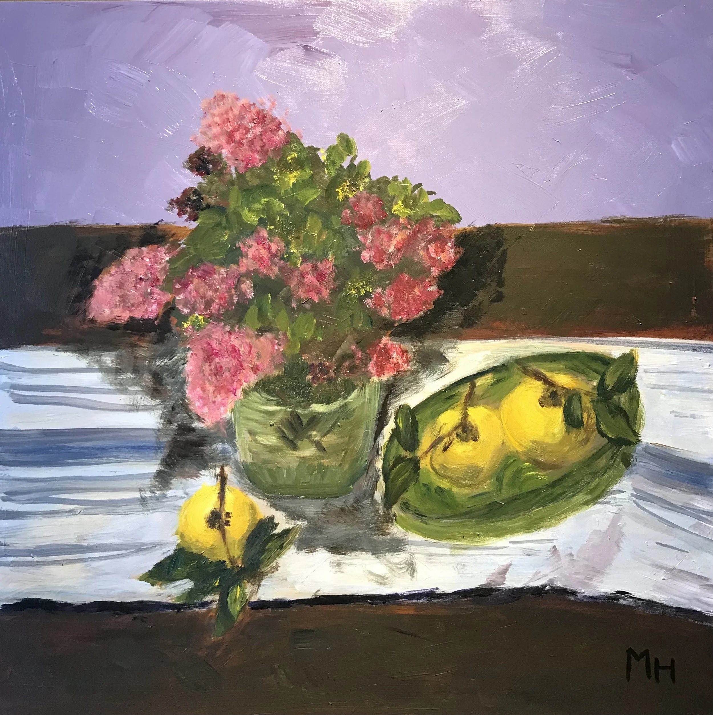 This painting was done during the time Hanoi was lockdown for Covid-19. Because no flower shop was opened, I cut some flowers from the street to bright my table.